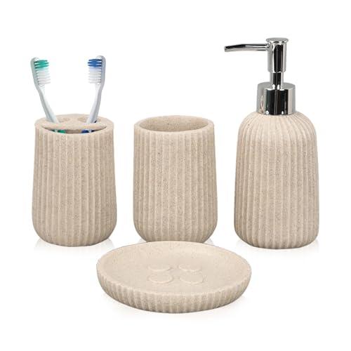 - BATHROOM ACCESSORIES SET 4 PIECE: Includes 1 soap dispenser, 1 toothbrush holder, 1 bathroom glass and 1 soap dish. Easily organize your countertops, keep your bathroom clean, tidy and organized.