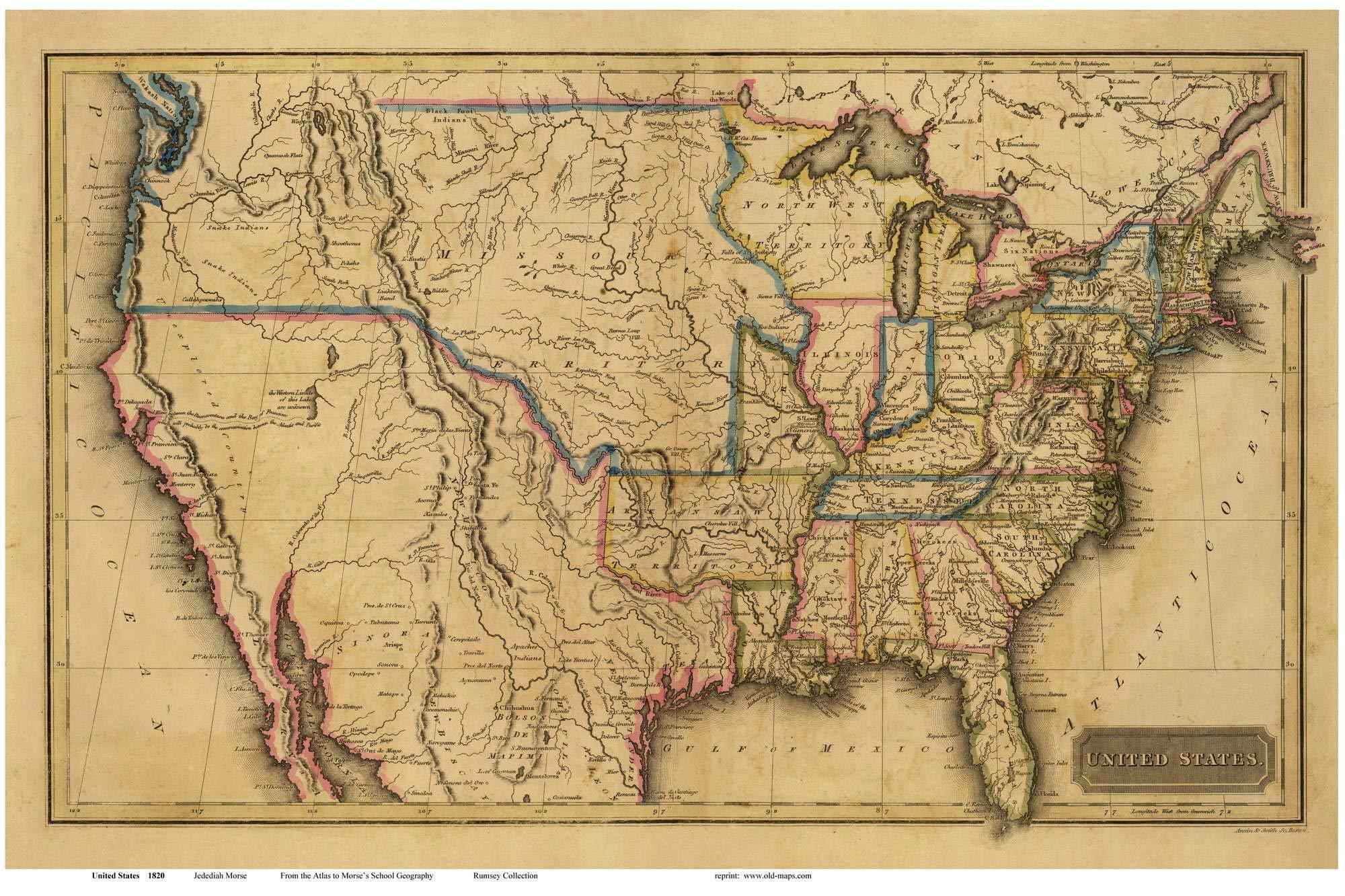 A fine reproduction of an early map of the United States of America. Rivers, mountain ranges, major cities and state boundaries are shown on this map. The original scan was acquired from the Rumsey Map Collection. We have edited the scan to improve the appearance for wall display. Orig. Size: 16" x 24". We offer this map reprint in different sizes. Printed in color on high quality color bond paper.