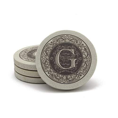 Thirstystone Monogram Letter "G" Absorbent Sandstone Coaster 4-Pack. Single Image, each Coaster has the same artistic design. Coaster measures 4 diameter. Manufactured in the USA of absorbent stone to absorb excess condensation from beverages. Cork backing protects your surfaces from scratches and stains. Size allows a larger glass or cup to be placed on them. Beautiful artistic design allows the Coasters to remain displayed even when not in use. This 4 pack Coaster Set makes a wonderful gift for family and friends at any time of the year. Look for our coordinating Placemats, Cutting Boards, and Lazy Susan to complete your own home design.