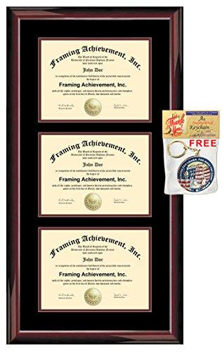 Triple degree frame vertical format license certificate plaque glossy traditional mahogany wood double three dual document state board certification. Three license certificate frame or triple diploma document plaque. We build quality college graduation diploma frames and certificate degree frames that holds three 3 degree or certificates. This degree frame will fit document size up to 8.5x11 or 11x14. Recognize college graduates hard work and achievements with our diploma frame gifts that give them the credit they deserve. Quality personalized triple certificate frame. Large affordable selection of high school and university graduation diploma frame gifts for your graduate. We make it easy to create marvelous personalized double or triple degree dual diploma frame gift for any university or high school graduate