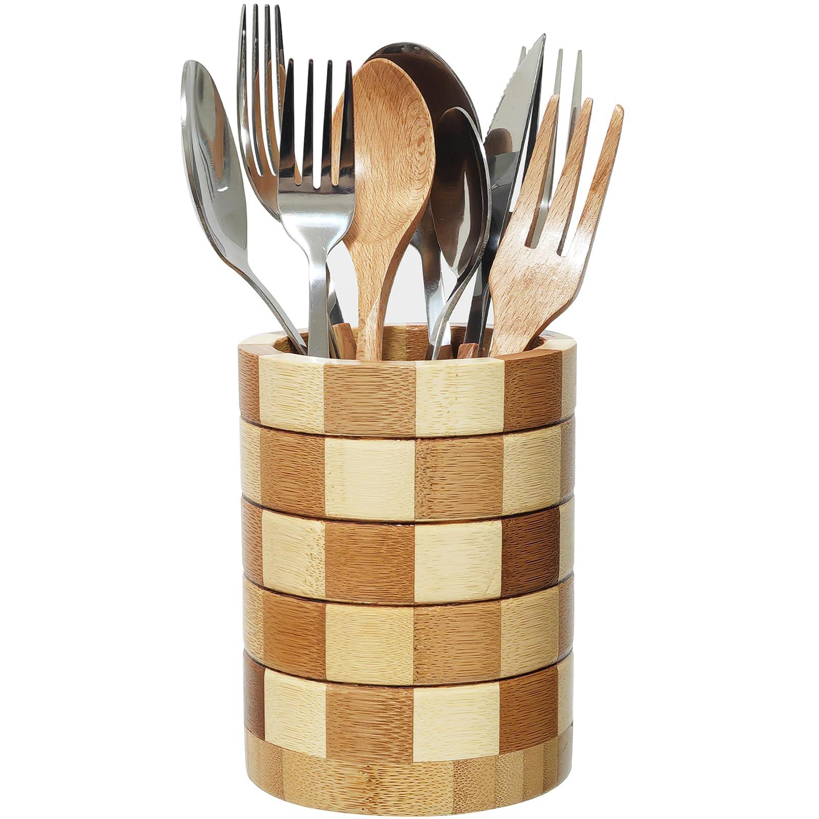- STRONG AND DURABLE: Compared with the ceramic silverware holder, the bamboo material is harder and not fragile. The wooden silverware holder is coated with varnish inside and out to isolate the air, making it less susceptible to moisture and cracking, and will last longer.