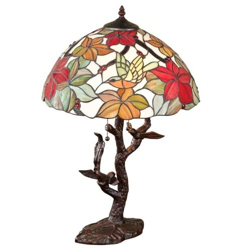 - SOPHISTICATED CRAFTSMANSHIP - The floral stained glass lamp will leave you wishing you were enjoying the beauty of nature in the middle of the rain forest. This handcrafted bedside table lamp features tropical flowers and a bird in colors of red, orange, green, and yellow. Shade is made with hand-cut and hand-soldered stained art glass. Metal base has a bronze finish and is shaped like a tree with birds. Dual pull chains will operate two 60 watt maximum bulbs. UL listed.