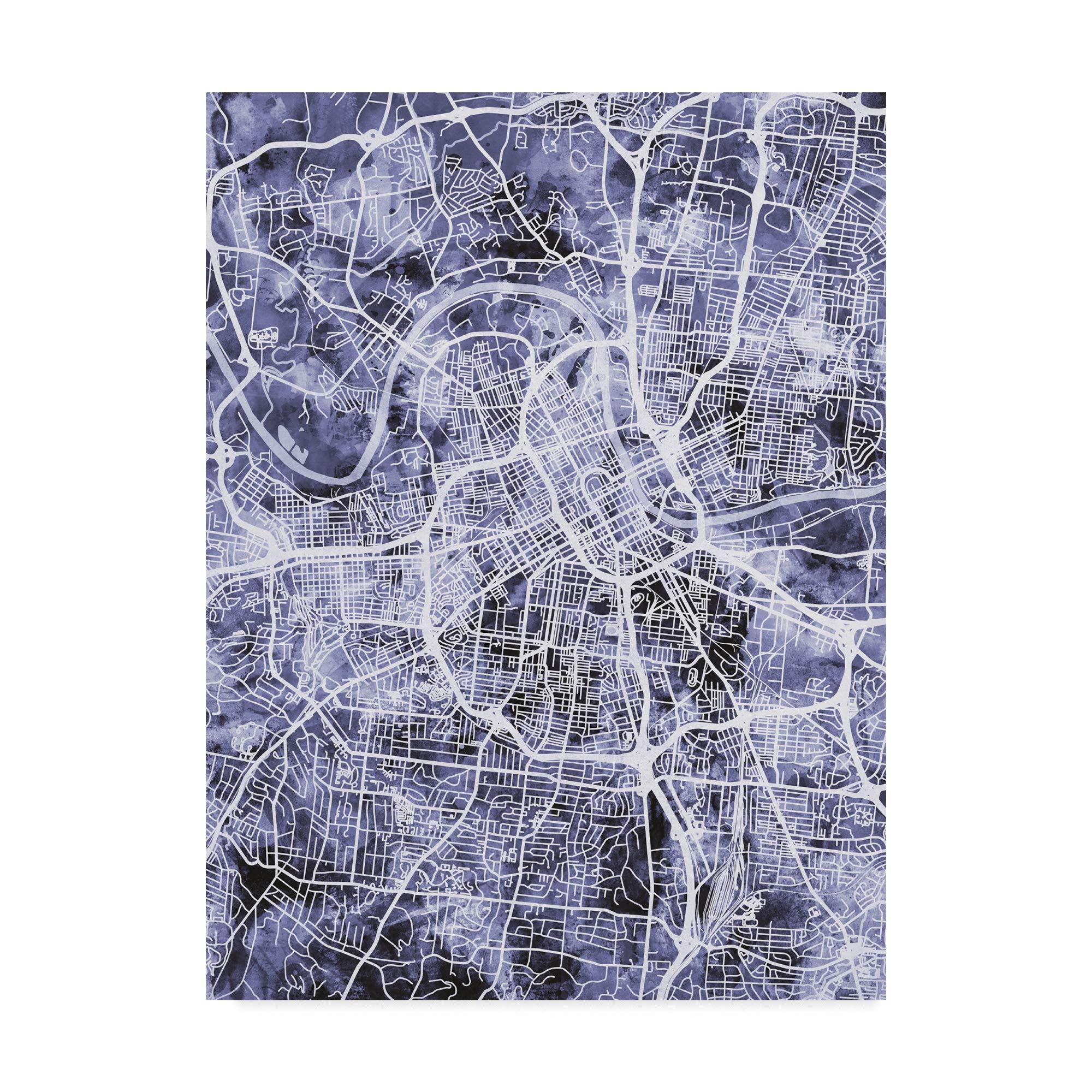 This ready to hang, gallery-wrapped art piece features a street map of Nashville, Tennessee on a blue and black watercolor background. Art and design were always Michael's favorite subjects at school. He was fortunate to land a job as a graphic designer at one of London's most prestigious publishing companies. After 12 years Michael Tompsett made the decision to pursue a full-time career creating his own work. The freedom and time to be able to focus solely on his own projects has been a wonderful experience. Although Michael likes to experiment with different styles and subjects, his main focus is on map art. He enjoys looking for unique and interesting ways to depict something which is very familiar. Maps are visual representations of the world We live in, a world which is incredibly diverse. Apart from maps, Tompsett creates urban landmark and cityscape designs. Giclee (jee-clay) is an advanced printmaking process for creating high quality fine art reproductions. The attainable excellence that giclee printmaking affords makes the reproduction virtually indistinguishable from the original piece. The result is wide acceptance of giclee by galleries, museums, and private collectors. Gallery wrap is a method of stretching an artist's canvas so that the canvas wraps around the sides and is secured a hidden, wooden frame. This method of stretching and preparing a canvas allows for a frameless presentation of the finished painting.,