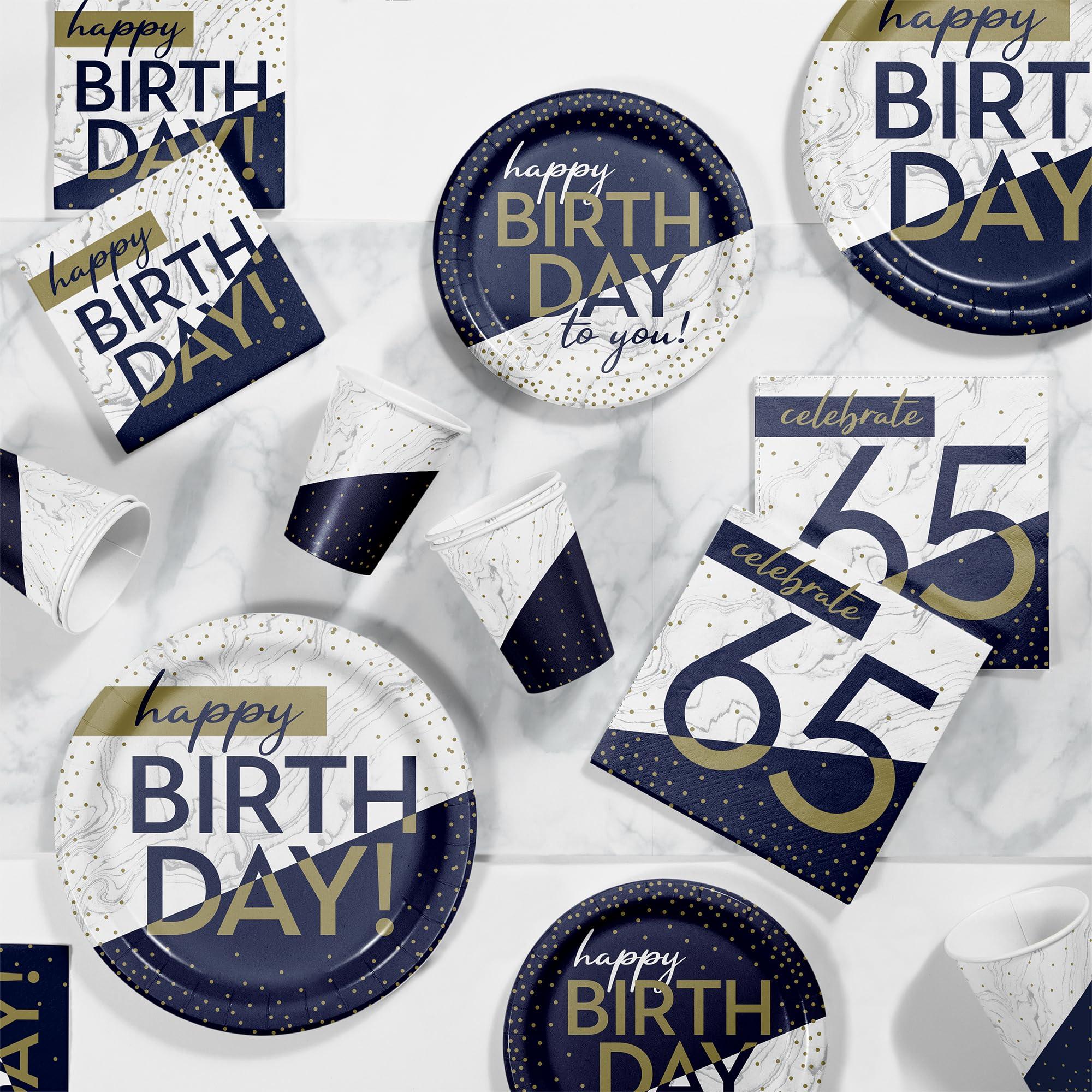 - Navy & Gold 65th Birthday Party Supplies Kit contains: 8 Navy and Gold Birthday Paper Plates (9"), 8 Navy and Gold Birthday Dessert Plates (7"), 16 Navy and Gold 65th Birthday Napkins (6.5"), 16 Navy and Gold Birthday Beverage Napkins (5"), 1 Marble Print Plastic Tablecloth (54" x 108"), and 8 Navy and Gold Birthday Paper Cups (9 oz)