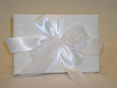 - White moire fabric book enhanced with satin and organza ribbon bows