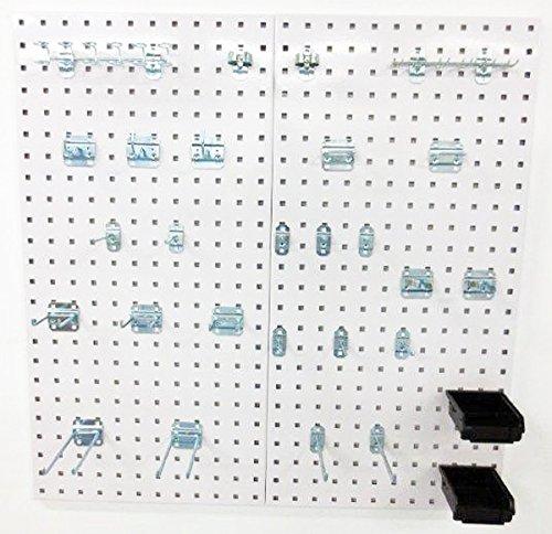 LocBoard heavy duty scratch resistant epoxy coated steel pegboard with square holes offers ultimate holding capacity for demanding storage needs. LocBoard kit is ideal for use in clean room, factory floor production, maintenance, repair areas, home and garage. Industrial strength LocHooks create the most reliable pegboard system available. Demanding tool storage requirements for power tools, large and odd shaped tools are easily met using LocBoard steel pegboards. Contents include (2) 18-Inch x 36-Inch LocBoards; 28 hooks: (1) Multi-Prong Tool Holder; (1) multi-ring tool holder; (2) 4-Inch Single Rod 30 Degree Bend; (2) 6-Inch single rod 90 degree bend; (2) 5-3/4-Inch Double Rod 80 Degree Bend; (3) 1-Inch Single Rod 30 Degree Bend; (3) 3-Inch Single Rod 30 Degree Bend; (3) 3-Inch double rod 90 degree bend; (3) 2-1/4-Inch Curved Hook; (2) Extended Spring Clip; (2) Standard Spring Clips; (2) closed hammer/pliers holder; (2) black Plastic Hanging Bins; mounting hardware included.