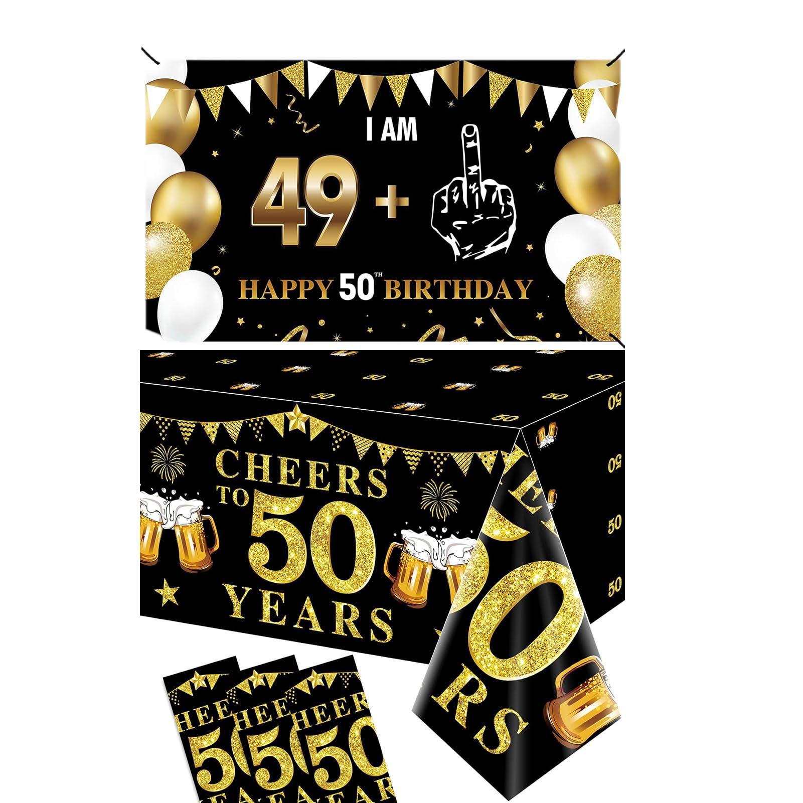 - [Funny design] - Our 50 years old theme backstop is composed of striking numbers "49+1". The striking "CHEERS To 50 YEARS" golden words are evenly distributed on both sides of the tablecloth. Party elements such as flags, stars and fireworks create a strong atmosphere for your party. The design is very interesting and attractive. It will be an unforgettable birthday party decoration.