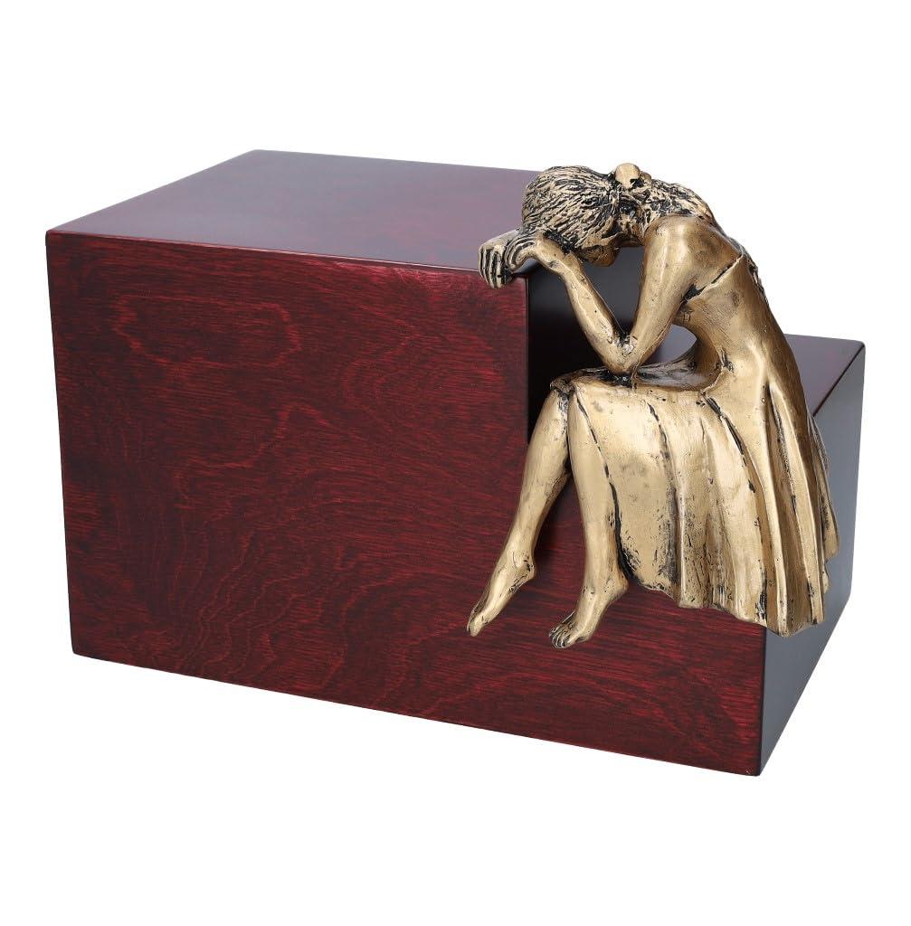 Art urn with memorial plaque and woman sculpture Cremation urns are not just containers where the cremated remains are placed. They mean more than this, because they accommodate your loved one inside them, and he or she certainly deserves a respectable resting place. An artistic cremation urn such as this beautifully designed Nostalgia Urn is surely a nice gesture towards your loved ones memory. Made from wood, stained in a mahogany colour, this handmade cremation urn deserves a key place in your home, to be a unique memory of your beloved one. Made by artists these vessels are one-of-a-kind works of art. What better way to honor the life of a loved one than to memorialize them with a beautiful work of art. The same Beautiful Urn You will not find anywhere else. This will give your loved one a truly unique cremation urn made specially for your loved one. Many of the artist made urns do not look like urns at all. You can display them on the fireplace mantel and no one will even know it is an urn unless you tell them. Our urns are handmade so the color shade may vary. Check out my other items. ----------------------------------- PRODUCT DETAILS Size: 18cm (W) x 19.5cm(H) x 28cm(L) Size: 7.1"(W) x 7.8"(H) x 11"(L) Dimension outside figure 22cm(W) x 22cm(H) x 28cm(L) Capacity: 4,8 Liters (292.9 cubic inches) Made from Wood&Ceramics-Bronze plated Bottom opening lid secured with screws