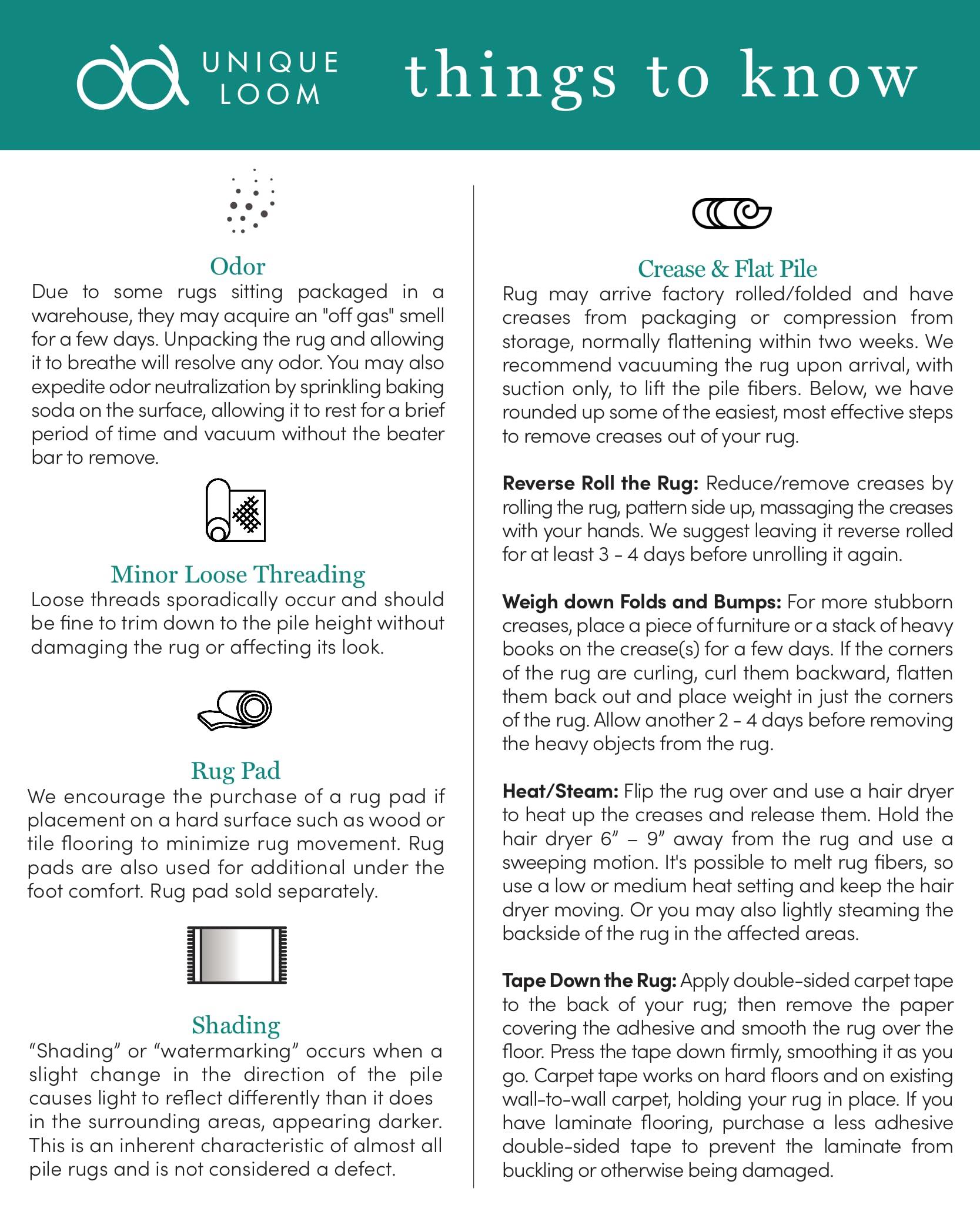 - SHIPPING: Rug will arrive factory rolled/folded and may have creases from packaging & compression from storage, normally flattening within 3-7 days. Reduce/remove creases by rolling the rug, pattern side up, & massaging the creases with your hands.