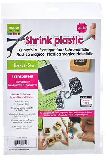 A fun craft activity for the whole family Children and adults will enjoy creating stunning projects with Vaessen Creative shrink art sheets. Shrink plastic (also called shrink film, shrinky dinks or shrink wrap), can be used to create all kinds of decorative objects such as keychains, pins, card embellishments or shrink charms. Choose a design and draw, trace or stamp onto the plastic shrink sheet with a permanent marker or ink. An alternative to drawing onto the shrinkable sheet is to punch out fun shapes with a craft punch. When making a keyring, charm or other project with a hole, please remember to punch or cut out the hole before baking the material. Holes also shrink about 7 times, so dont make them too small. Bake it, Shrink it Cut out the drawing or design and place it on greaseproof paper directly onto a baking tray. Pop in the oven and bake at 150C / 300F / Gas mark 3 (low) for 2 to 3 minutes. The process develops very quickly and you can watch your project begin to shrink The plastic sheet will shrink rapidly and curl in on itself. This is a necessary part of the process for the material to properly develop. It will go back flat on its own. After baking, the plastic material will shrink and thicken up to 7 times its original size When taken out of the oven, if the shrink process has completely finished the material should be pliable. You can choose between flattening your project by placing it underneath something flat and heavy like a book or you could bend your shape (ideal for creating napkin rings, Christmas ornaments, jewellery etc.) and carve into it with an embossing pen. If, however, the material is curled and cannot be flattened the shrink foil has not been completely through the process. Please note that your shrinky shape cannot be reheated after it has cooled down and will not shrink with further re-heating. The shrink art sheets are available in various bright colours (yellow, purple, blue, green, red, orange) as well as white, black, transparent and frosted /matte. This pack includes: 4 x shrink art sheets Size: Sheet sizes may vary slightly. Most are somewhat larger than A4 size, measuring 21 x 30 cm or 8.26 x 11.81 inches (standard A4 measurements are 21 29,7 cm or 8.27 11.69 inches).