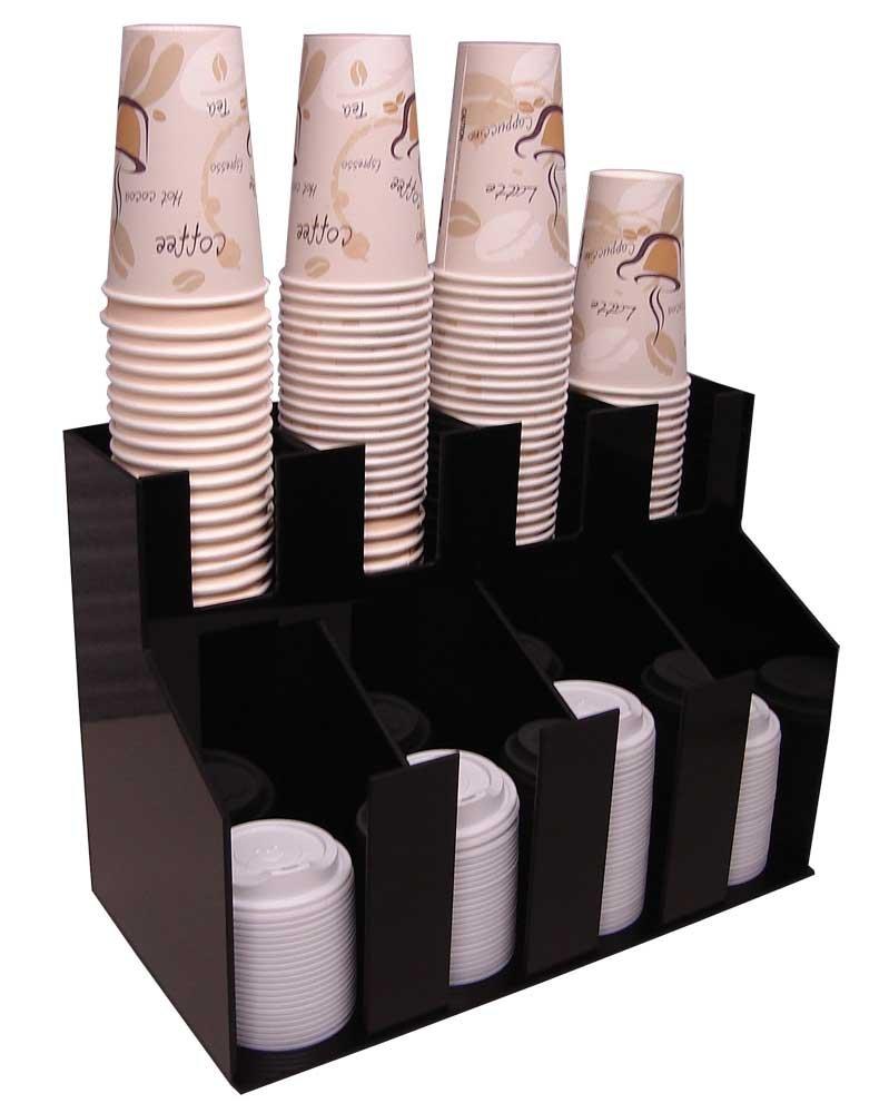 This commercial Coffee Cup & Lid Dispenser has sections for cups and lids you have most coffee items in one neat area. Do you have a one-sided coffee counter and are you limited on space? This vertical coffee cup and lid dispenser is for you. There are eight sections total with 4 of space in each section. Four for cups and four for the lids that go with the cups. You can neatly store cups and lids sizes 8 ounces up to 24 ounces with ease. This dispenser will hold any size or type of cup (foam, plastic and paper) from any manufacturer. This coffee cup dispenser is made of extremely durable 3/16 acrylic. Total unit dimensions are: 12 tall by 16 wide by 8 deep. All RCS Plastics products are made in our offices in the USA.