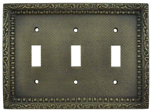 L-DKW21 Victorian Style Triple Light Switch Plate Cover in Antique Brass Finish. This switchplate has been precision-cast from metal and graphite molds. Competitors offer thin stampings and/or rough sand castings. This design is so unique that we've copyrighted it. This standard triple gang switch cover measures 4 7/8" in height and 6 5/8" wide. Choose from polished brass; antiqued finish brass, or nickel plated.