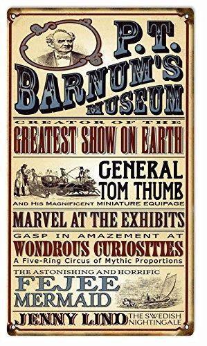 PT Barnum's Museum Greatest Show On Earth General Tom Thumb Marvel At The Exhibits Wondrous Curiosities FeJee Mermaid Sign. 8"x14" .040 Aluminum. This Sign Has Rivets. Made In The USA.