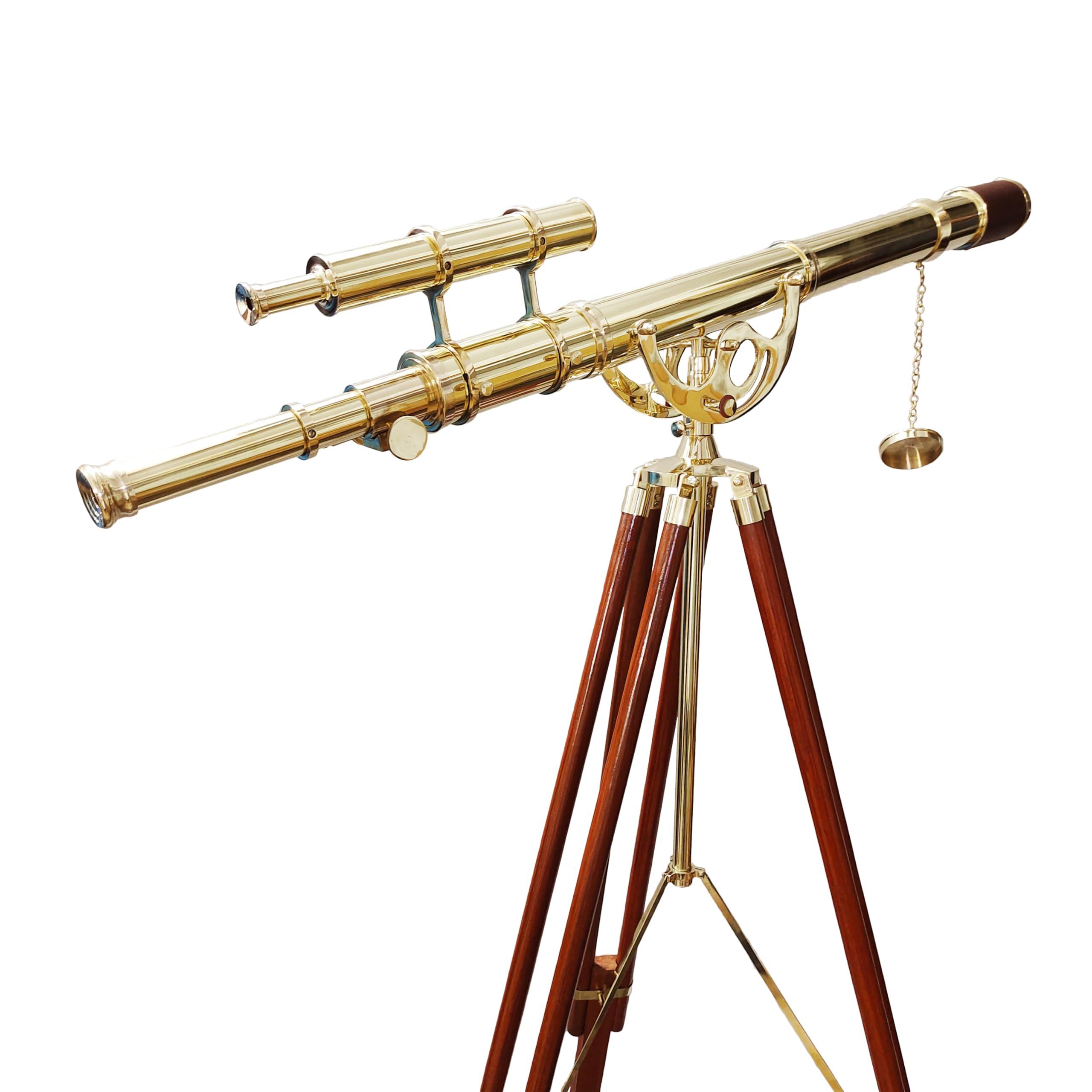 - Enhance your space with timeless maritime elegance through this Vintage Brass Telescope, featuring a shiny brass finish and the latest double barrel design. Expertly handcrafted with attention to detail, this nautical telescope stands tall on an adjustable wooden tripod, offering both stability and classic style. The addition of rich brown leather wrapping adds a luxurious touch, perfectly blending function with antique charm. Ideal for stargazing, coastal viewing, or simply as a decorative centerpiece.
