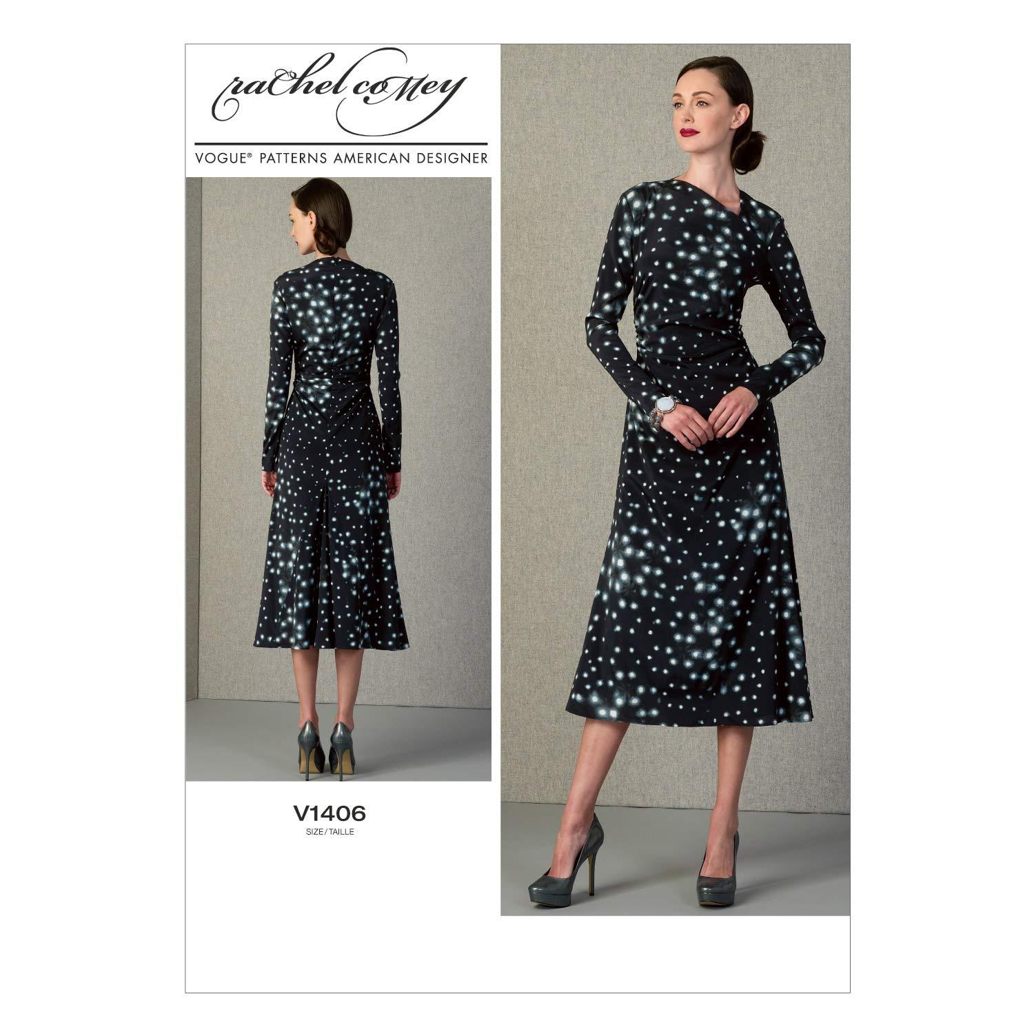 MISSES' DRESS: Partially lined dress (close-fitting through bust) has left back extending into yoke front, no left side shoulder seam, gathered sides and back, back godet, bias armhole and underarm binding and invisible back and sleeve zippers. Narrow hem. FABRICS: Crepe de Chine, Charmeuse, Heavy Georgette Unsuitable for obvious diagonals. With Nap Without Nap NOTIONS: 22" Invisible Zipper, Two 7" Invisible Zippers, Seam Binding and Hook & Eye. Combinations: A5(6-8-10-12-14),E5(14-16-18-20-22).