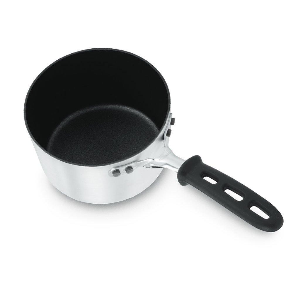 This Wear-Ever tapered sauce pan is ideal for making sauces and soups. Constructed from 11-gauge impact-resistant energy-efficient 3004 aluminum with TriVent silicone handle. The trivent silicone handle is rated at 450-DegreeF (232-DegreeC) for stovetop or oven use. Heat is spread evenly along base and sidewalls. This TriVent handle has a unique ergonomic design that reduces stress and fatigue. The vented handle design reduces heat transfer from pan to handle, maximizing operator comfort. This tapered sauce pan has steel coat x3 interior premium non-stick coating which easy to clean-up, reduces need for cooking oil. Double-thick rims remain round for a better cover fit and double-thick bottoms help resist denting. This sauce pan fitted with the evertite riveting system. Beadles rims for easy cleaning. NSF listed. Comes with 4-1/2-quart capacity. Measures 9-1/4-inch top diameter by 7-9/16-inch bottom diameter by 5-inch inside depth.