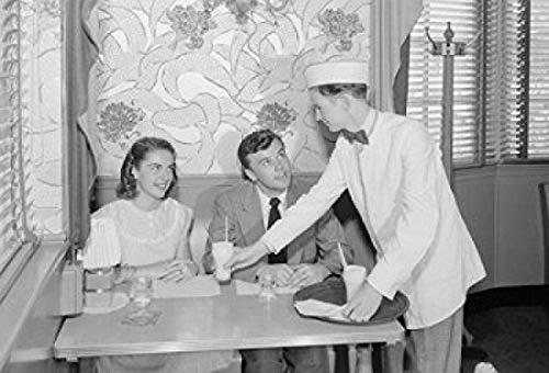 Waiter serving young couple in cafe Poster Print (18 x 24)