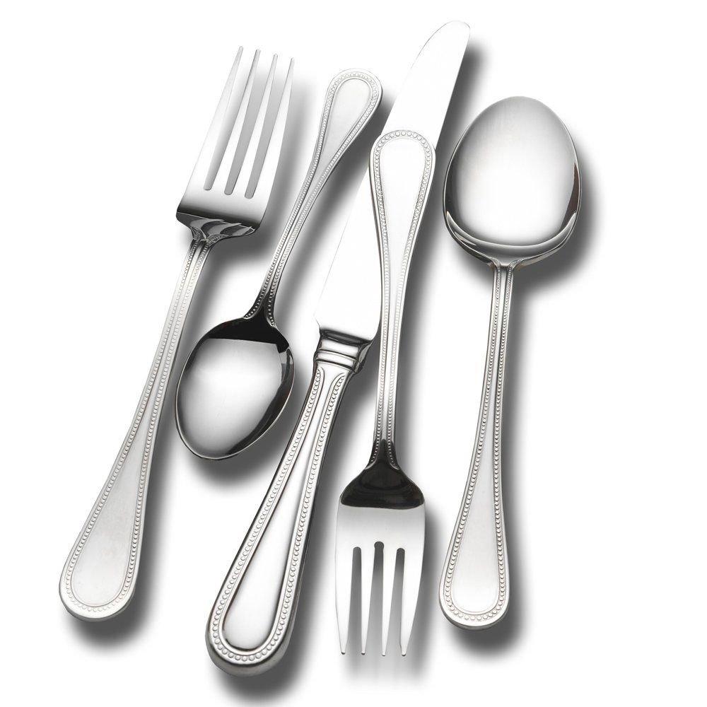This Wallace Continental Bead 65-Piece Flatware Set brings a touch of European elegance to your table. Expertly crafted from 18/10 stainless steel, each piece has a substantial teardrop shaped handle framed by an elegant, beaded trim design. Timeless and sophisticated, this versatile set is perfect for entertaining on any occasion, from a casual brunch to a formal dinner party. 65-piece set, service for 12, includes 12 each of salad fork, dinner fork, dinner knife, dinner spoon, and teaspoon, plus 1 each of serving spoon, slotted serving spoon, serving fork, spreader, and condiment spoon. Dishwasher safe.