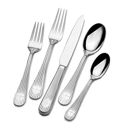 This impressive Wallace Elite Tribute Flatware Set features reeded handles accented with a shield motif to add tailored texture to your table settings. Quality crafted of premium 18/10 stainless steel, this set will stand up to the rigors of everyday use. 20 piece set, service for four, includes (4) each: dinner fork, salad fork, dinner knife, MORE dinner spoon and teaspoon. Dishwasher safe.