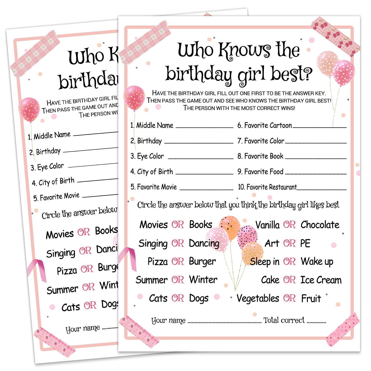 - EASY TO PLAY: the birthday girl game cards arrive ready to hand out and play, it's easy to write your answers on; Fill in the blank and multiple choices questions for friends to answer about the birthday girl