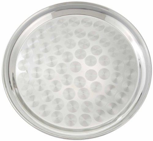 Winco 14 inch round stainless steel swirl service tray STRS-14. Perfect for serving drinks in a bar or at home. Corrosion resistant and long lasting. Deep lipped edge for better handling.