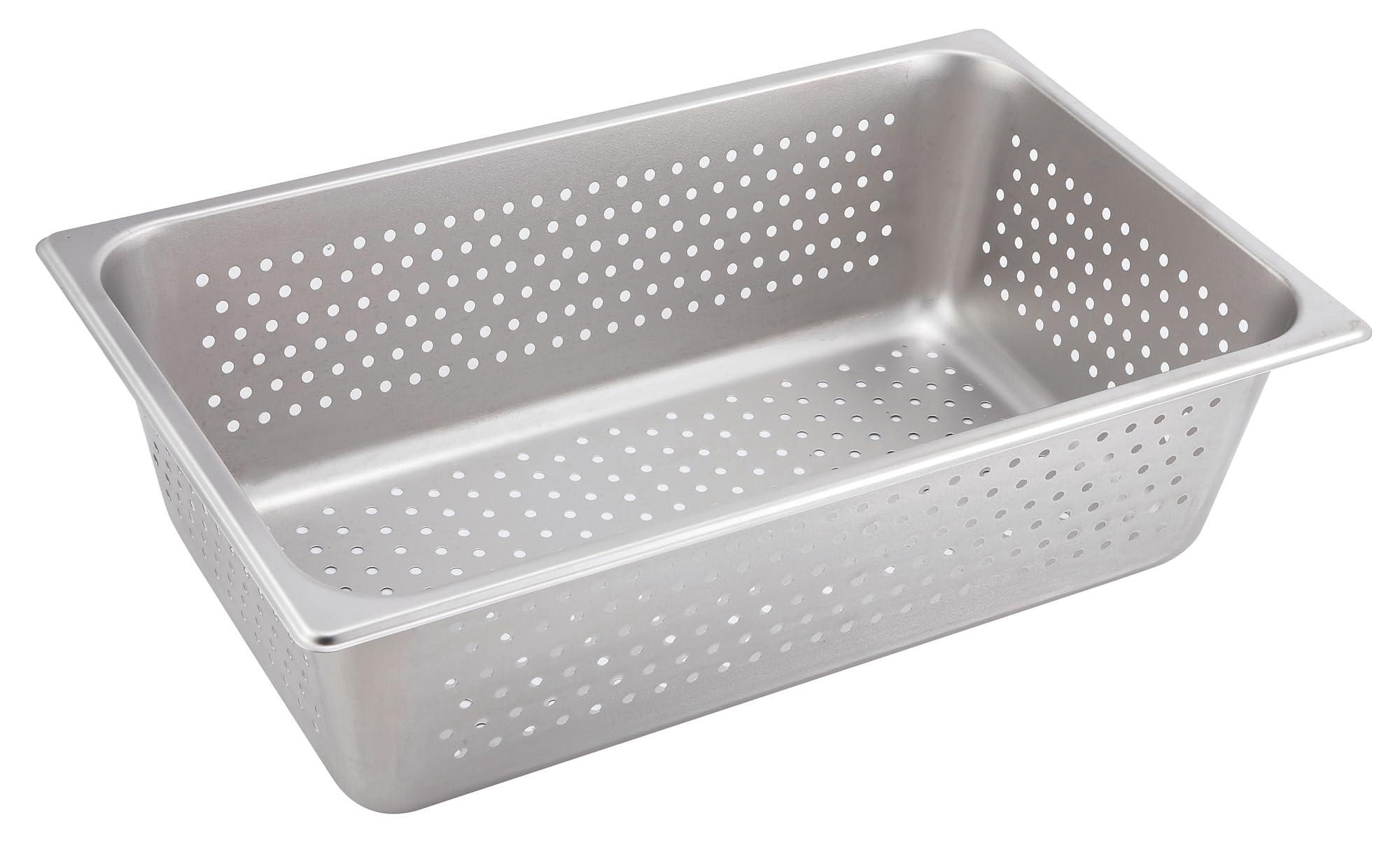 This Winco SPFP6 is a full size perforated steam table / hotel pan ideal for use in buffets, restaurants and catered events. The drain holes allow moisture to quickly drain away from food ideal for vegetables and meats. This 6 deep food pan is stackable for easy storage. Made from 18/8 grade stainless-steel, these pans are designed to withstand daily use in a foodservice environment. The reinforced corners ensure this pan can go from freezer to oven without warping. The rounded corners ensure food wont stick for quick and easy clean up. Dishwasher safe. NSF certified.