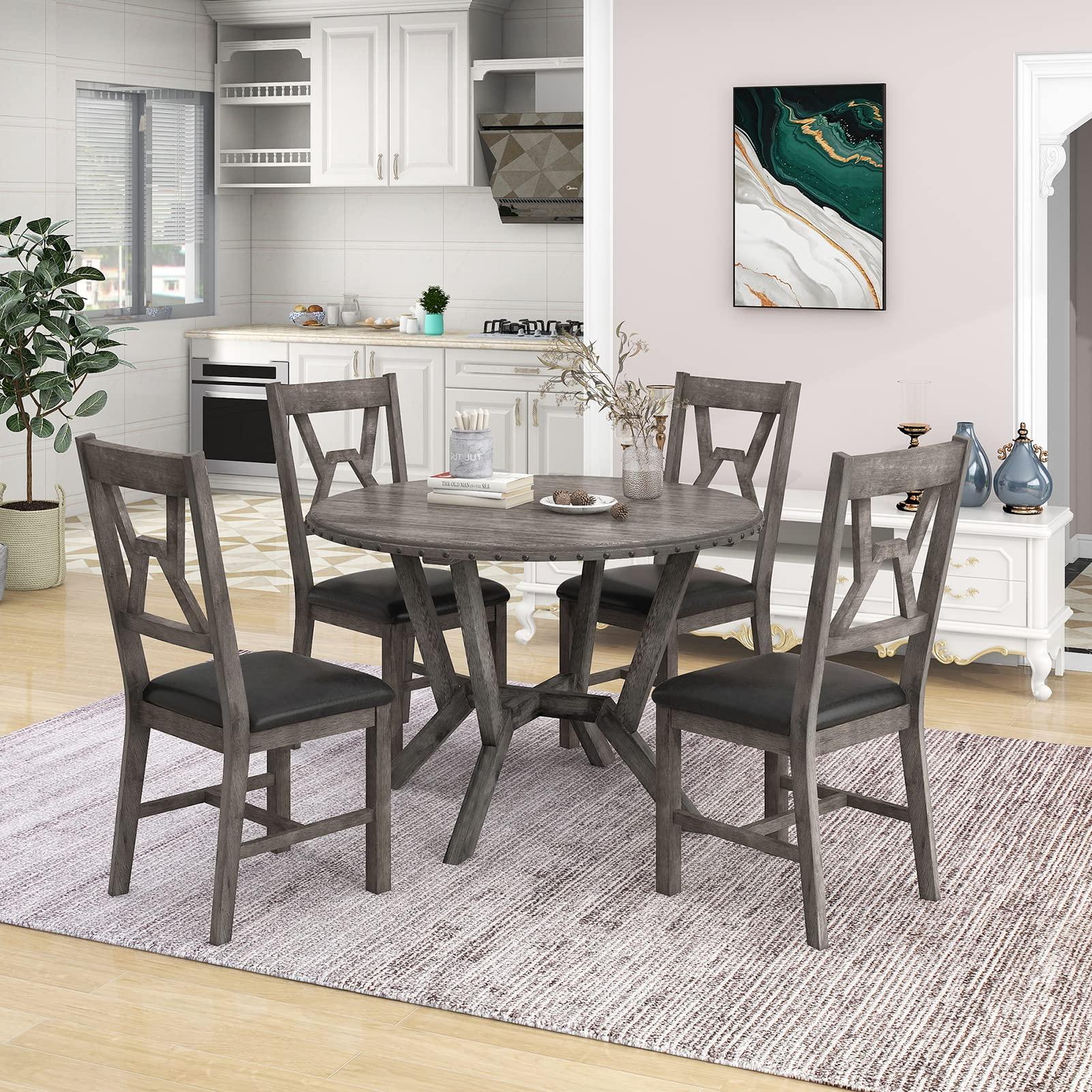 This round dining table set brings elegant mid-century flair to your home. Featuring an understated silhouette with clean lines,your visitors a sense of decency and sophistication at first glance. Soft linen-covered cushions on each dining chair make the seats more comfortable.This dining table set will blend perfectly with any of your unique dcor.You'll love this dining table set!