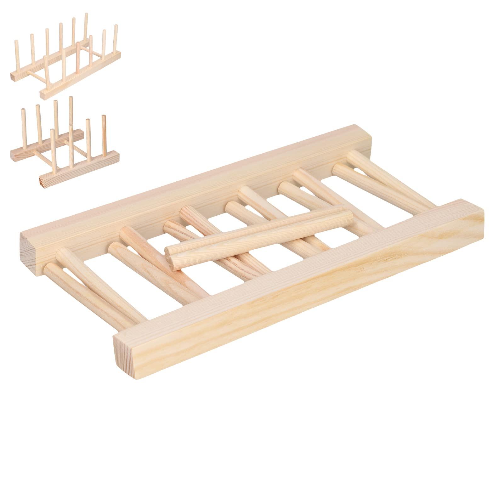 WOOD MATERIAL: Plate organizer for kitchen cabinets is made of pine wood, sturdy and easy to clean. Special exterior finish. Will not crack or warp. Stable and sturdy, this rack features lightweight, durability and high quality.