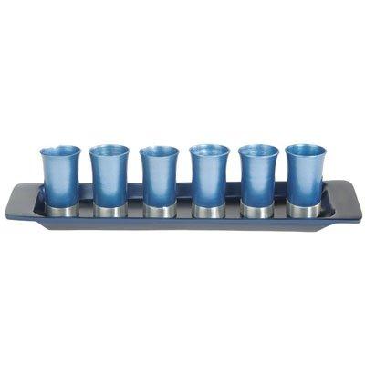 Anodized aluminum Height of each cup: 3" / 7.6 cm Width of tray: 13" / 33 cm We are proud to present an exciting line of Artistic Judaica by Yair Emanuel. Your Sabbath table is about to change for the better - forever! The gleaming futuristic look of this kiddush cup is unlike anything you've ever seen before! The brushed metal finish, the space-age texture and materials, the futuristic color scheme, the overall shape evocative of a classic kiddush cup -- it all adds up to a totally unique and unprecedented statement! Use it to share kiddush with guests on the Sabbath and holidays, or to share liqueur or schnapps at any festive occasion. Artist Yair Emanuel, a graduate of the Bezalel Academy of Art and Design, lives and works in Jerusalem. Vivid and harmonious colors as well as a mixture of the old and the new characterize Emanuel's work, which is designed and crafted in his Jerusalem studio. The principal techniques utilized encompass painting on silk, hand-embroidery, raw-silk appliqu and painting on wood.