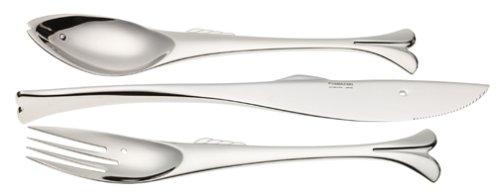 This 5-piece Gone Fishin' place setting features a 6-1/2-inch salad fork, a 7-1/2-inch dinner fork, a 9-inch knife, a 7-1/2-inch soup spoon, and a 6-1/2-inch teaspoon. Especially charming is the knife, which can balance on the edge of its high-carbon steel blade as if swimming across the table. Coordinating serve pieces are also available, and Yamazaki includes a full lifetime warranty against defects. --Emily Bedard