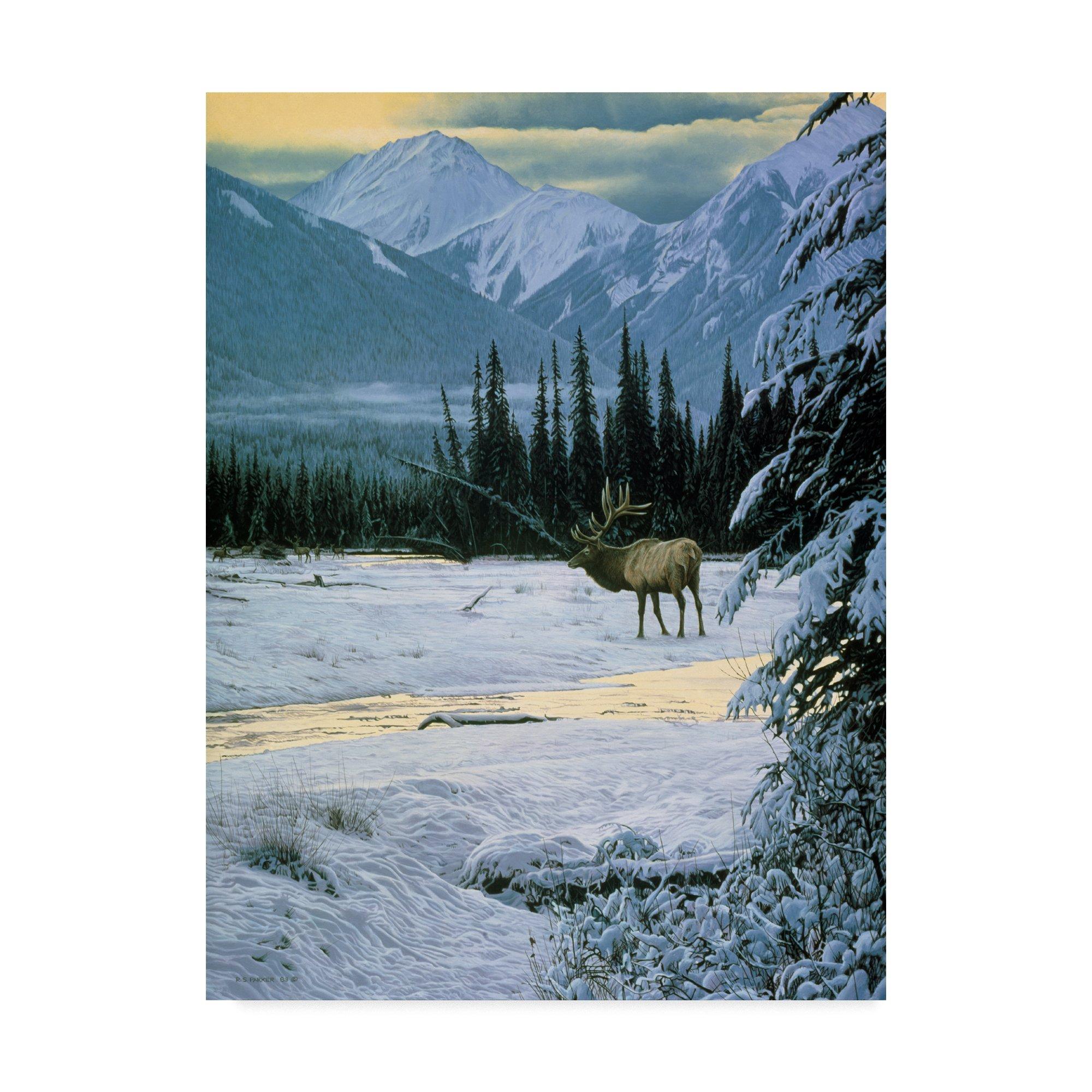 This ready to hang, gallery-wrapped art piece features an elk making its way across the snow covered landscape. Ron Parker began painting as a career a little late in life. At the age of 35, he was inspired, after seeing an exhibition of original paintings by Fenwick Lansdowne, to try painting wildlife himself. His first effort, in 1977, was successful and he quit work and began painting full time. Using watercolors, a medium with which he was familiar, he began doing vignette paintings of birds and mammals, Within four months he was selling originals through the Harrison Gallery in Vancouver. Giclee (jee-clay) is an advanced printmaking process for creating high quality fine art reproductions. The attainable excellence that Giclee printmaking affords makes the reproduction virtually indistinguishable from the original piece. The result is wide acceptance of Giclee by galleries, museums, and private collectors. Gallery wrap is a method of stretching an artist's canvas so that the canvas wraps around the sides and is secured a hidden, wooden frame. This method of stretching and preparing a canvas allows for a frameless presentation of the finished painting.