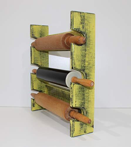 This Rolling Pin Rack features slots to hold 3 rolling pins. This rolling pin rack can comfortably hold most standard sized and shaped rolling pins. This rack could be used for both storage and display of your rolling pins. This will allow you to keep your work surface clear and available for use. This rack will look great hung in your kitchen and it's coloring and design are sure to complement a wide array of decor. This Rolling Pin Rack is made from pine wood. This rolling pin rack has been painted a yellow This rack has been painted a yellow color and has been given an antiqued look to make it look aged and old. A coat of lacquer has been applied to help protect the wood. Drywall anchors and screws are provided in order to help with mounting this rack directly to the wall. The specific dimensions of the Rolling Pin Rack: 16 inches tall 14 1/2 inches wide 3 1/4 inches deep