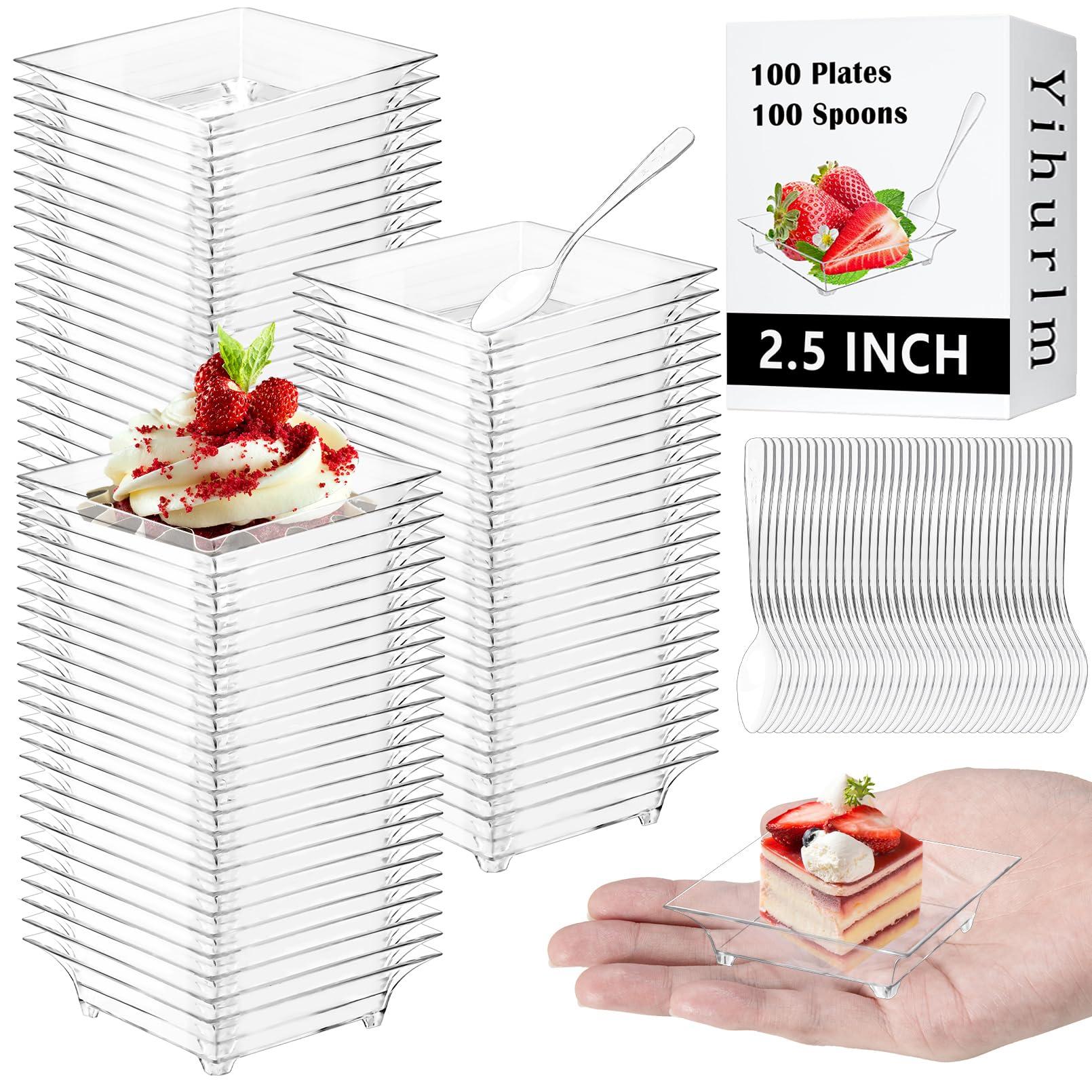 Yihurlm Yihurlm Mini Dessert Plates with Spoons,100 Pack 1 oz 2.4\" Mini Appetizer Plates,Reusable Crystal Clear Plastic Square Mini Plates for Desserts Appetizers Sauces Fruit Cake Tastings