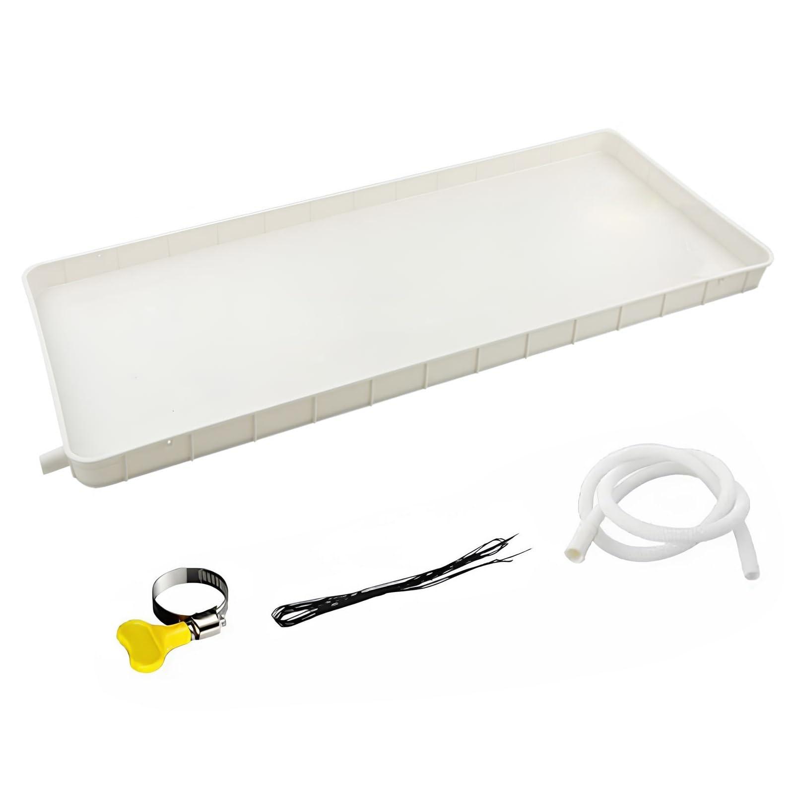 - Multiple Sizes AvailableAir conditioning drain tray size 81.5x33x3cm/32x13x1.2in, 91.5x45x3cm /36x17.7x1.2in, also with drain pipes of different lengths (200/300/400cm) a variety of size options, suitable for different brands of AC units. Whether you have a 1-2P or 3-5P air conditioner unit, our Air Conditioner Outdoor Unit Water Collecting and Drainage Pan can meet your needs