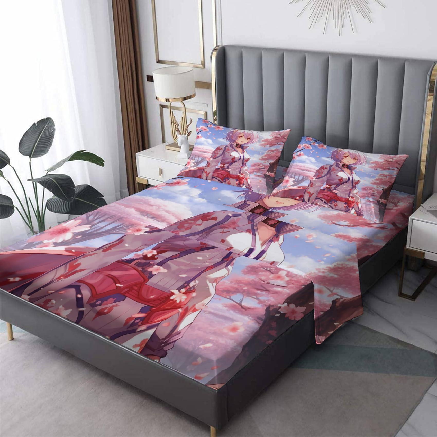 zcsm Anime Girl Sheets California King Sheet Sets - Japanese Cherry Blossom Bed Sheets, Soft & Deep Pocket & Wrinkle Free Bedding Sheets & Pillowcases,1 Fitted Sheet, 1 Flat Sheet, 2 Pillow Cases