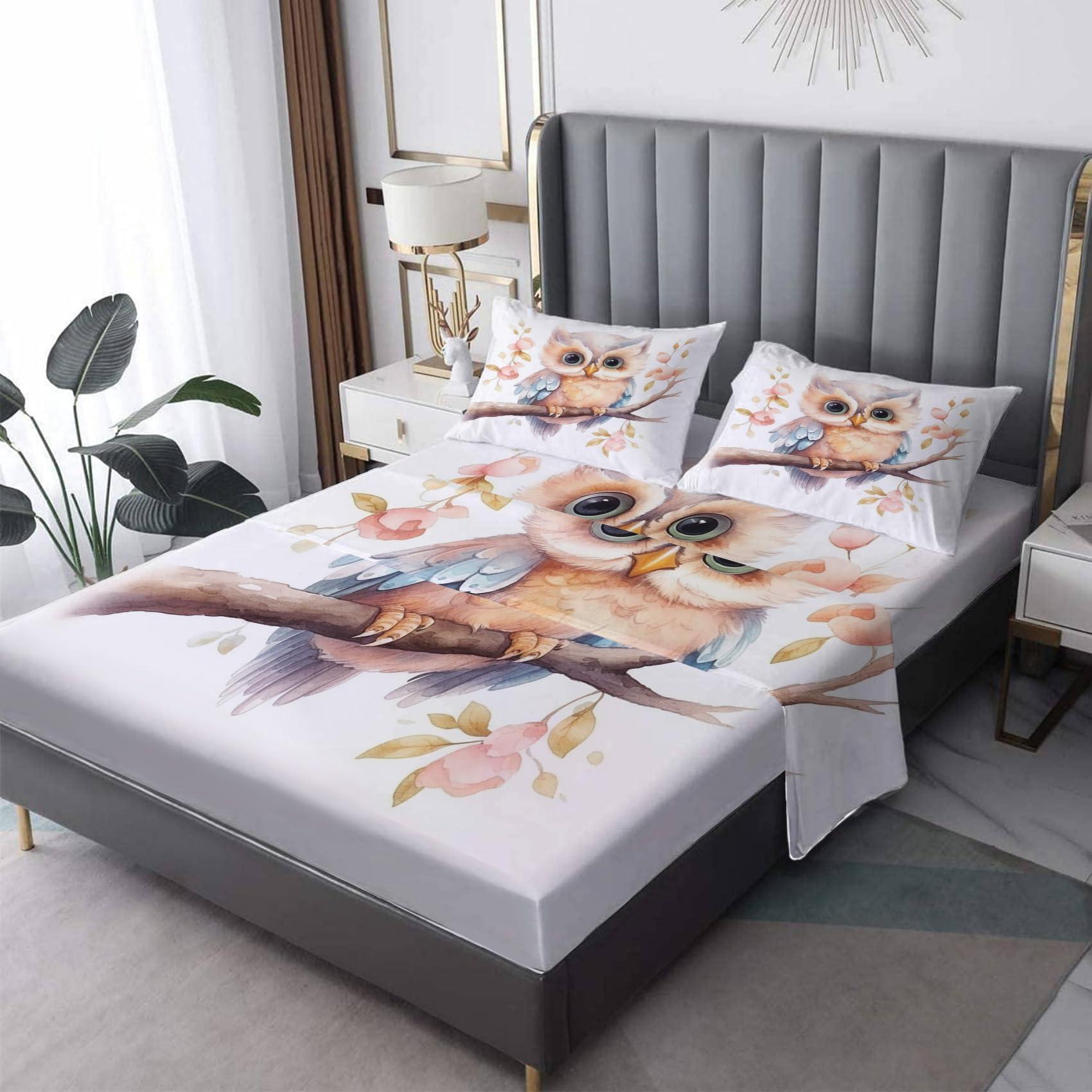 zcsm Full Size Sheet Sets - Owl Bed Sheets, Kids Bedding Sheets & Pillowcases, Soft Microfiber & Deep Pocket & Wrinkle Free Patterned Sheet Set, 4 Piece (1 Fitted Sheet, 1 Flat Sheet, 2 Pillow Cases)