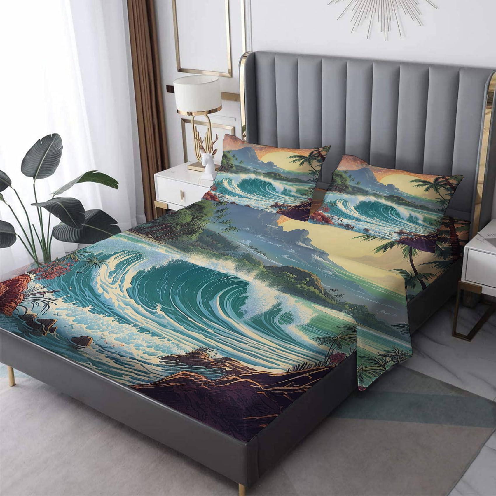 zcsm Wave Sheets Twin XL Sheet Sets - Tropical Hawaiian Landscape Bed Sheets, Soft Microfiber & Deep Pocket & Wrinkle Free Bedding Sheets & Pillowcases, 1 Fitted Sheet, 1 Flat Sheet, 1 Pillow Case