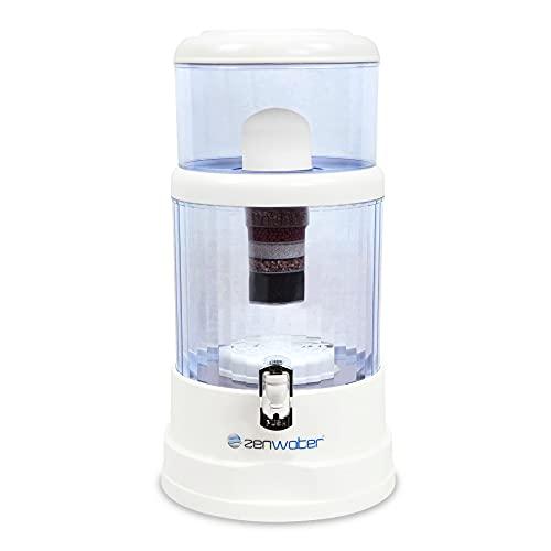 Zen Water System transforms ordinary tap water to clean, delicious, alkaline mineral water. This system uniquely combines 5 different functions into 1 system: 1.) Filter; 2.) Purify; 3.) Alkalize; 4.) Mineralize; 5.) Magnetize. The benefits are endless. The Micro-Ceramic Filter contains millions of tiny pores that measure 0.2 to 0.5 micron in size, which removes up to 99% bacteria, trap harmful contaminants, parasites and effectively reduce manmade chemicals, pesticides, herbicides and toxins. 5-Stage Mineral Filter Cartridge contains activated carbon which purifies your drinking water by eliminating bad taste and foul odor, leaving water crispy clean with a mountain spring fresh flavor. The silica sand contains superb absorbent qualities to remove impurities in the body and is known to aid in the formation and strengthening of connective tissues. The far-infrared ceramic balls are commonly used in alternative medicine to increase enzyme activity in digestive tract, improve memory function, regulate blood pressure, boost metabolism, strength and vitality. Mafia Mineral Stones infuse water with micro-nutrients and essential minerals such as calcium, zinc, potassium, manganese and increase alkalinity of water. Zen Water is eco-friendly and BPA-Free. It requires no electricity or plumbing and operates purely on gravity. No more bottled water and plastic waste. The system is compact, portable and pays for itself in about less than 2 months time. Turn your dirty tap water into healthy, delicious mineral water at your fingertip. Get one for the office or the cabin. Keep one handy for emergency or natural disaster. Capacity: Top holding tank is 2-gallon; Bottom storage tank is 4-gallon. Filter life: Ceramic filter is 1,000 gallons or 1 year; 5-Stage Filter is 500 gallons or 6 months; Mafia Mineral Stones is 3 to 5 years. System can be used with or without the base. Not recommended for use with microbiologically unsafe water.