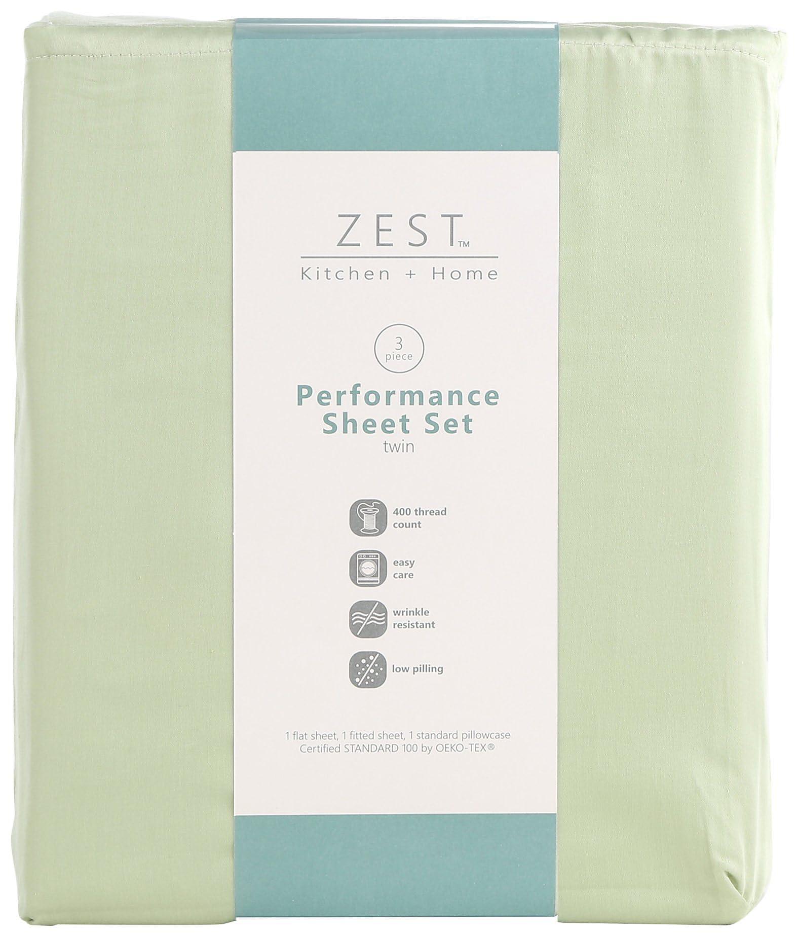 ZEST Kitchen + Home is designed to help you celebrate life every day. Our passion for quality embodies every product, providing timeless style with a modern touch. Only available at Bealls Florida! This sheet set features 400 thread count on 100% cotton fabric, 1 standard size fitted and flat (full measurements for each size in traits) and two standard size pillow cases (1included with the twin set.) Fabrication is 100% cotton. Certified STANDARD 100 by OEKO-TEX.