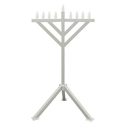 Celebration Display Electric Menorah. Manufactured with sturdy PVC (Polyvinyl chloride) for a product that is built to last. Product stands 52 in. high X 30 in. wide. Easy assembly and disassembly - instructions included. UL approved. Weather-proof. Outdoor electrical cord included. Uses standard chandelier type bulbs.