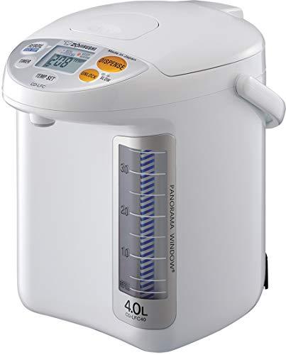 Zojirushi's Panorama Window Micom Water Boiler & Warmer (CD-LFC40) is a 135 oz. capacity water boiler that boils and keeps water hot at a set temperature for as long as it's plugged in. Select from one of 4 keep warm temperature settings (160 DegreeF, 175 DegreeF, 195 DegreeF, 208 DegreeF) which are the optimal temperatures for brewing different varieties of tea. The Optional Quick Temp mode reaches 160 DegreeF, 175 DegreeF, or 195 DegreeF keep warm directly without reaching a boil. Includes energy-saving timer function (6-10 hours), Cafe drip dispensing mode for slower dispensing, and Swivel base for serving convenience. Non-stick interior is easy-to-clean, and Descaling mode keeps the pot sparkling clean by using Zojirushi's citric acid cleaner.