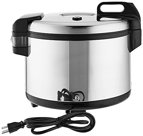 Beautifully constructed with a durable stainless-steel exterior, this 20-cup electric rice cooker and warmer can cook up to 40 servings of great tasting rice--large enough for catering or commercial use. Once the rice is cooked, the unit automatically switches to its "keep warm" mode, which maintains a perfect serving temperature without altering the food's consistency. The rice cooker's inner pan features a water-measuring line for convenient filling, along with a nonstick coating to prevent rice from sticking and to ensure easy cleanup. An extra-large rice spatula is included. The 1300-watt rice cooker and warmer measures 17-1/4 by 17-1/4 by 13-1/2 inches.